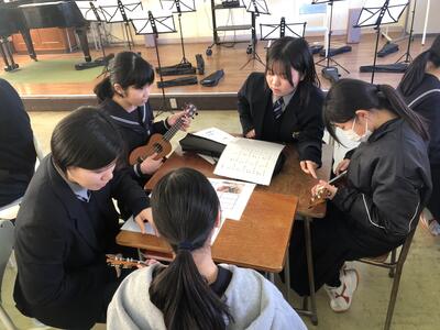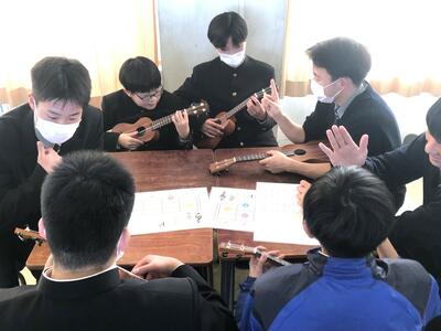 「ウクレレ」という楽器の名前は知っているけど実際に見たことがない、どんな音か聴いたことがないという生徒も多く、興味津々でした。