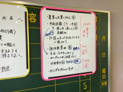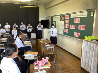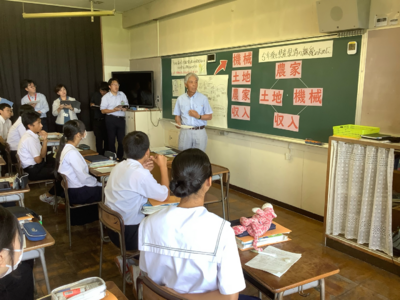 そして授業の最後には、実際に大東地区で農業を営む吉田さんにお話を伺いました。吉田さんからは農家の現実的な視点を教えていただき、生徒たちの考えがさらに深まったようです。