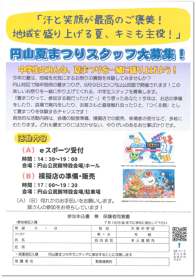 さて、今回は8月9日(土)に開催される『円山夏まつり』🍉のスタッフ募集です。会場の設営、受付から模擬店での販売まで「つくる側」として地域のために活躍しませんか? もちろん、円山地区以外の生徒も大歓迎!